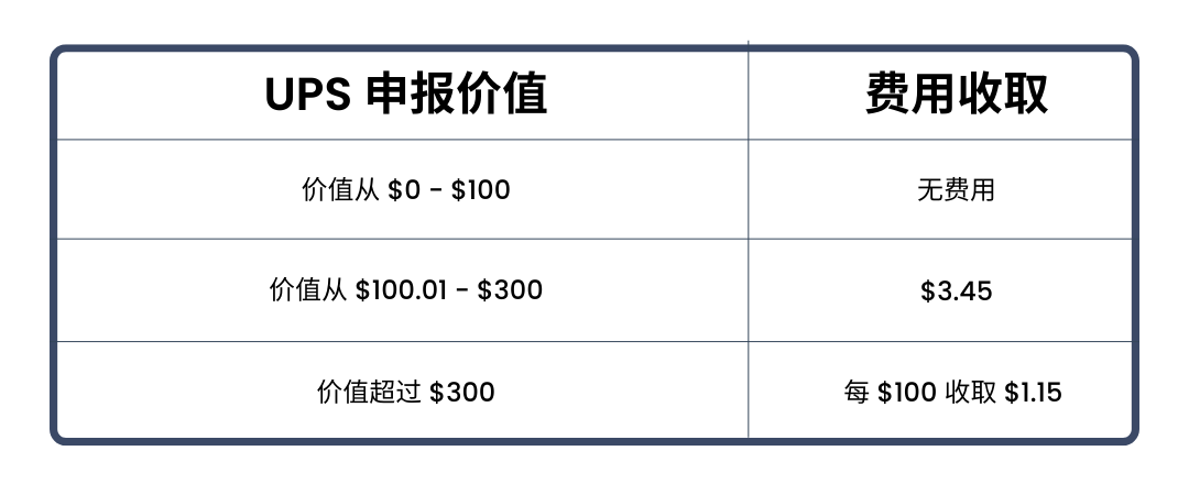 正如剛剛提及的,UPS不超100美元的申報(bào)價(jià)值基本都是免費(fèi)的。可是假如在100>n<300這一個(gè)區(qū)間,將要收取3.45美元。假如大于300美元,每100美元的申報(bào)價(jià)值會(huì)收取1.15美元。
