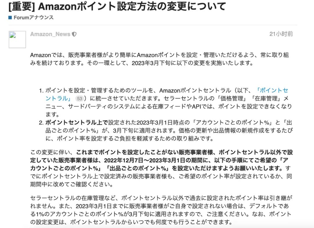 亞馬遜日本站發(fā)布了公告稱為了讓賣(mài)家更加輕松地設(shè)置及管理亞馬遜積分,它的設(shè)置方法變更將于2023年3月下旬升級(jí),下面是公告內(nèi)容: