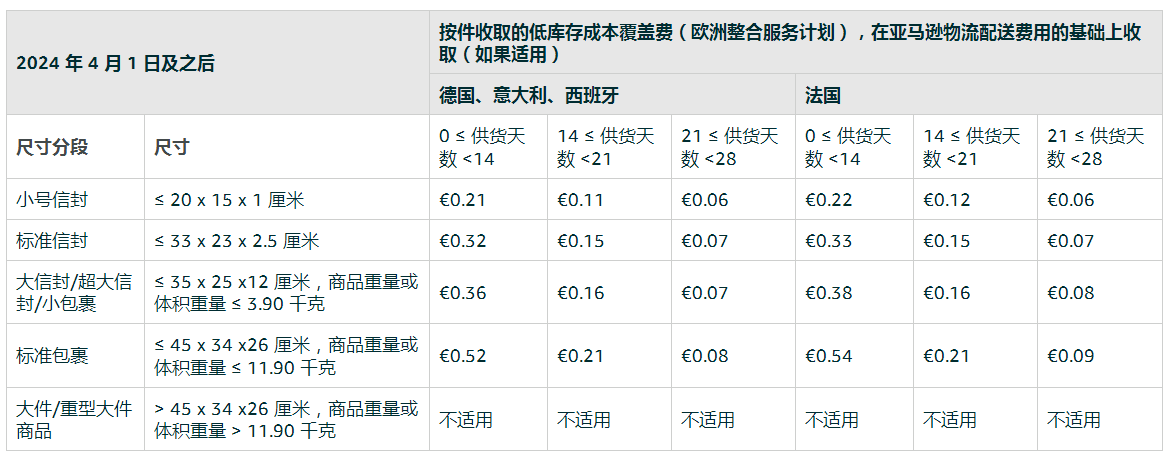 自2024年4月1日起,針對(duì)通過亞馬遜物流歐洲整合服務(wù)(Pan-EU)計(jì)劃配送的標(biāo)準(zhǔn)尺寸商品,假如德國、法國、意大利和西班牙商城的庫存商品數(shù)量相較于已發(fā)貨商品數(shù)量低過28天,亞馬遜將收取低庫存成本覆蓋費(fèi)。