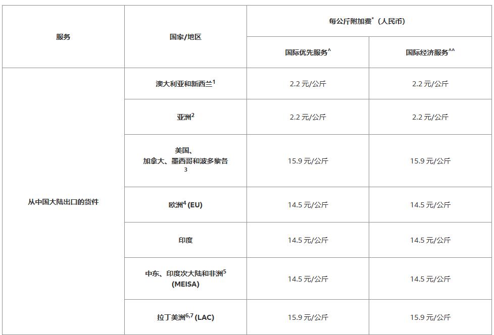 Fedex則計(jì)劃于9月16日起征繳需求附加費(fèi)。Fedex方聲稱(chēng)當(dāng)運(yùn)量增長(zhǎng)、運(yùn)力需求的增加、運(yùn)營(yíng)成本增加還有其運(yùn)營(yíng)網(wǎng)絡(luò)面臨別的壓力時(shí),F(xiàn)edEx也許會(huì)收取需求附加費(fèi),詳細(xì)如下↓
