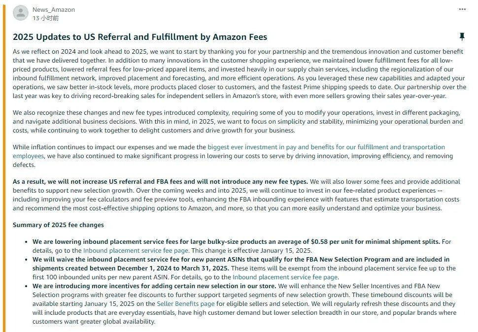 就在賣家們對亞馬遜的高昂費(fèi)用感覺到無奈之際,亞馬遜突然宣布了2025年的新政,表明2025年將不會提高美國銷售傭金和
