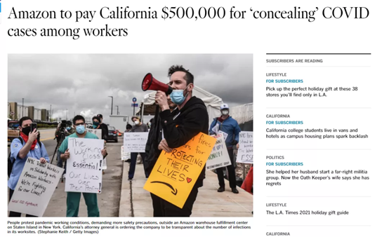 在此次判決當(dāng)中,亞馬遜不但被開(kāi)出了“疫情管控不利”罪名下最高的罰金50萬(wàn)美金,更加是被規(guī)定一定要每一天將倉(cāng)庫(kù)內(nèi)的新冠感染狀況告知到其數(shù)萬(wàn)名倉(cāng)庫(kù)工人,并披露其工作場(chǎng)所的準(zhǔn)確病例數(shù)。
